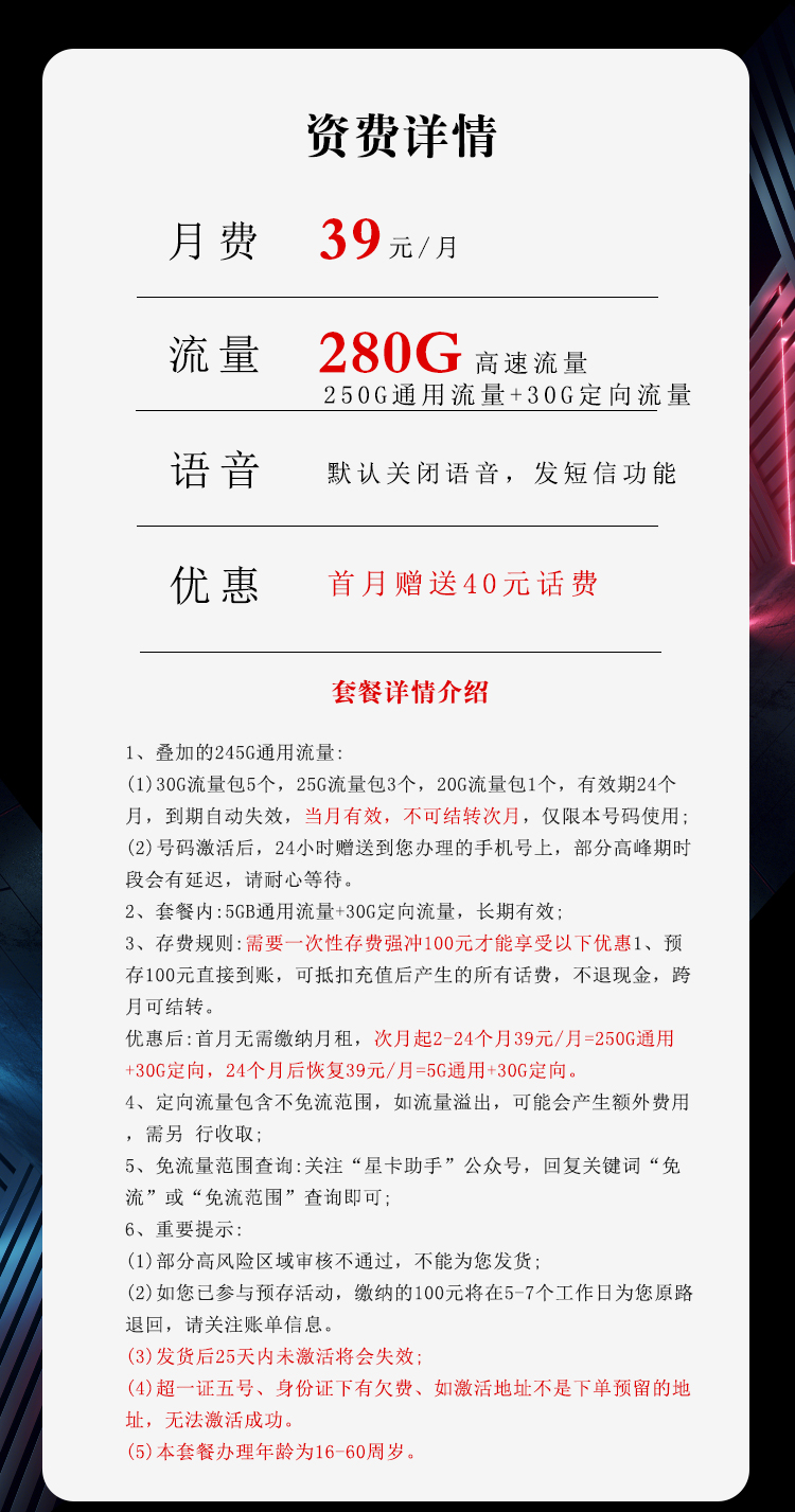 月费39元/月流量280G高速流量250G通用流量+30G定向流量